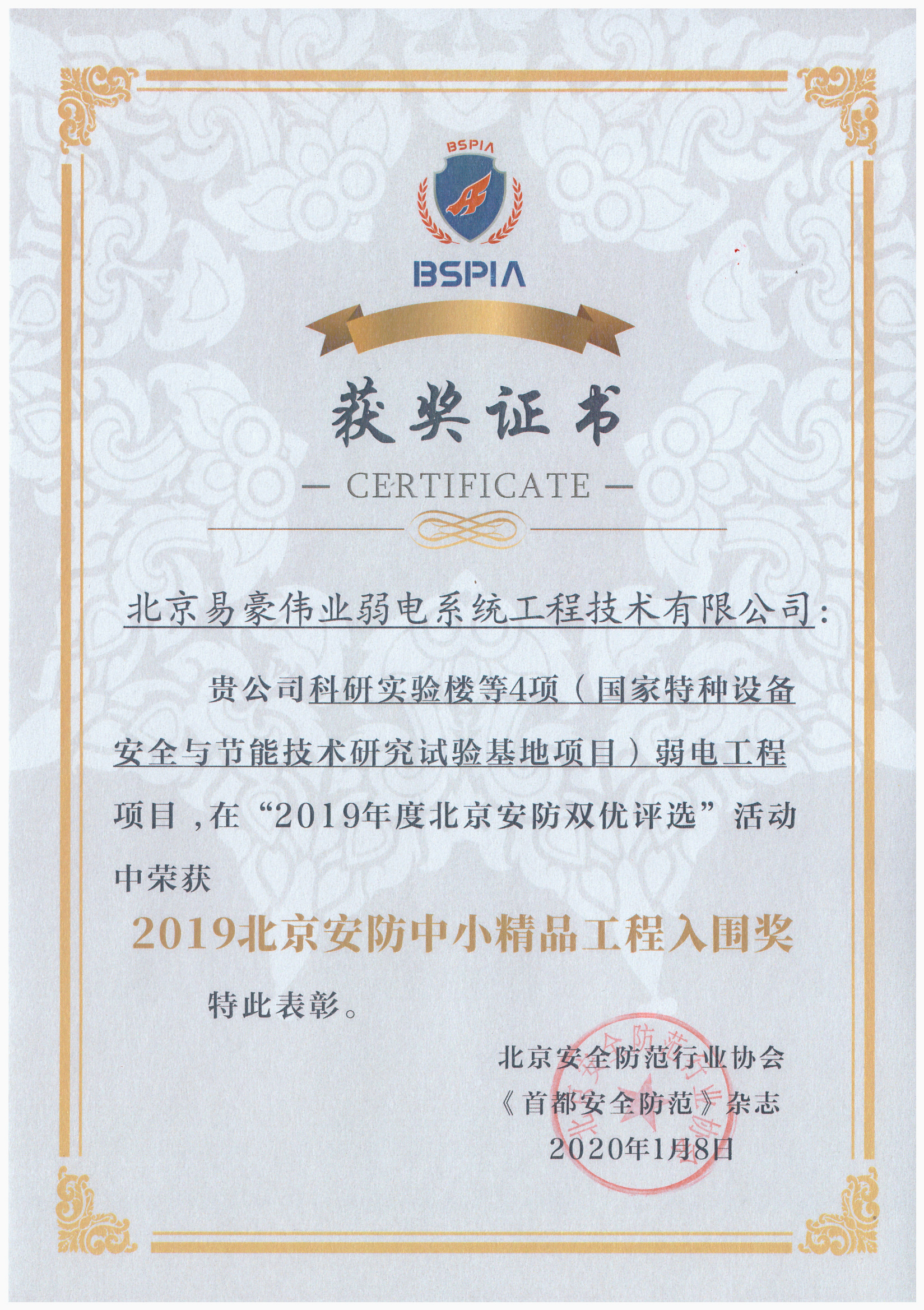 2020年1月8日,我公司科研實驗樓等4項(國家特種設(shè)備安全與節(jié)能技術(shù)研究試驗基地項目)弱電工程項目,在“2019年度北京安防雙優(yōu)評選”活動中榮獲2019北京安防中小精品工程入圍獎。