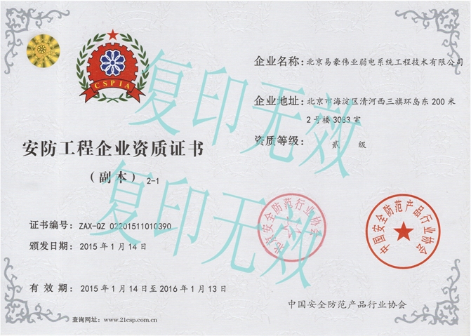 我公司于2015年1月獲得安防工程企業(yè)貳級資質(zhì)。