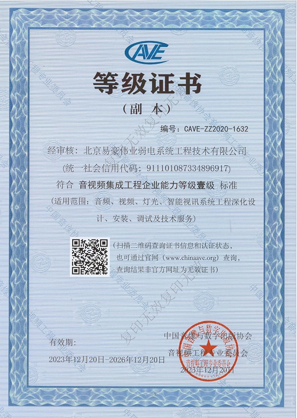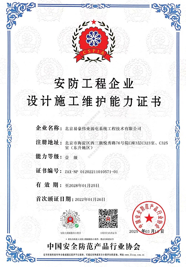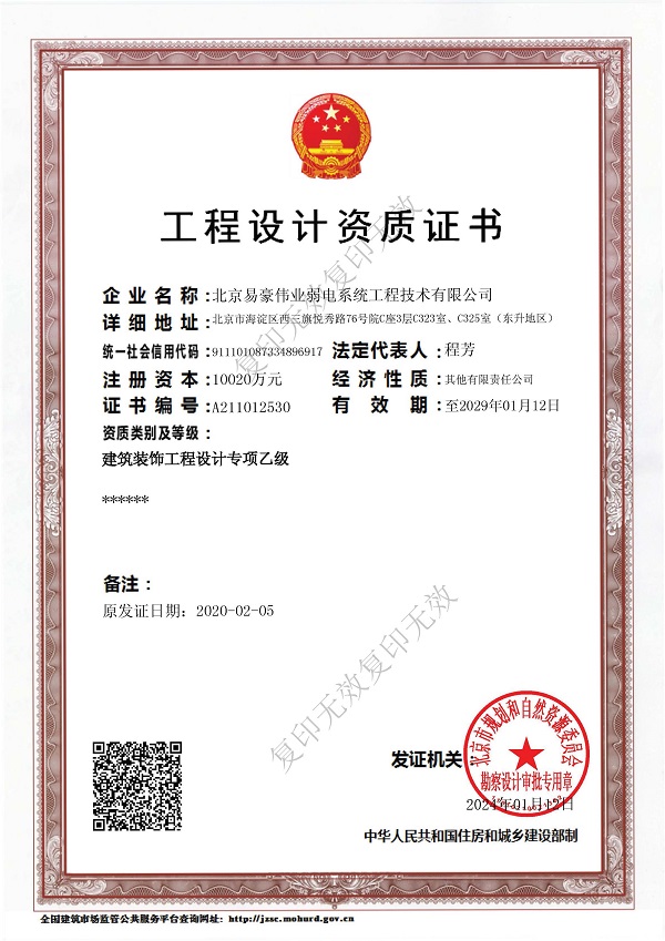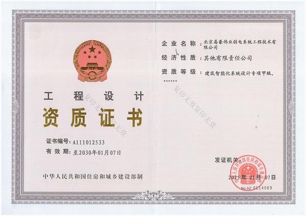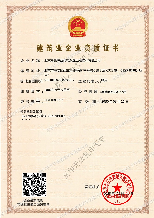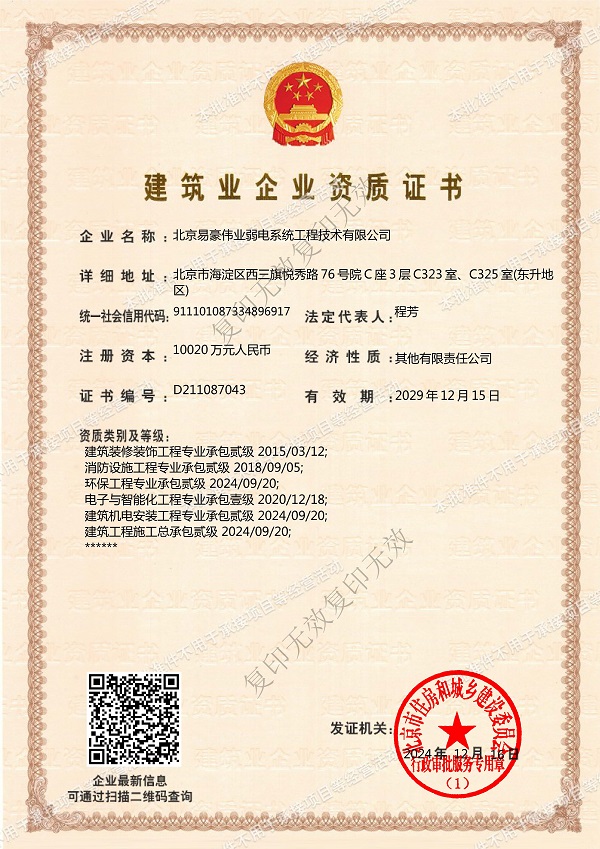 電子與智能化工程專業承包壹級、建筑工程施工總承包貳級、建筑裝修裝飾工程專業承包貳級、