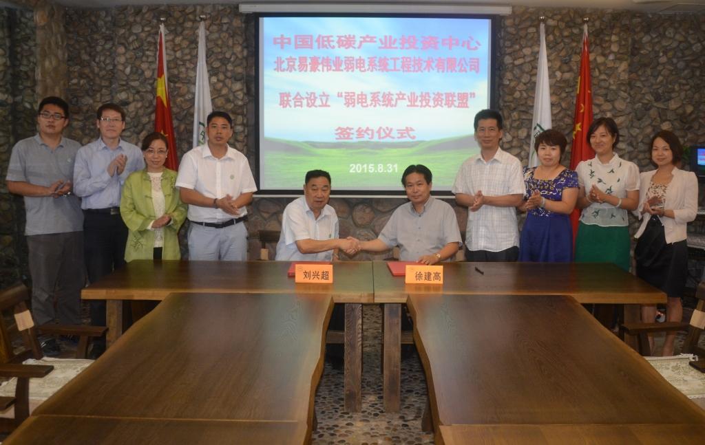2015年8月31日,北京易豪偉業弱電系統工程技術有限公司與與中國低碳產業投資中心聯合設立“弱電系統產業投資聯盟”,將充分發揮資源優勢互補的大好局面,為中心在全國布局的【低碳智慧新城、低碳產業示范園、中華民族文化城】等項目建設提供強有力的技術支撐及產品保障,為實現“低碳中國、綠色家園”貢獻一份力量!